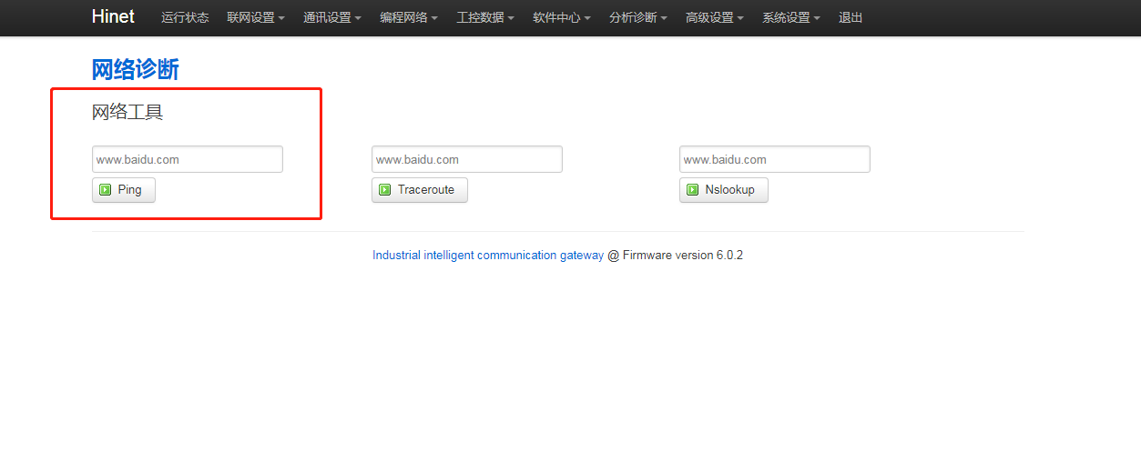 2.PLC的IP是否错误,进网关后台,点击“分析诊断 - 网络诊断”,输入PLC的IP点击【ping】,如果网关LAN口IP与PLC的IP在同网段,而此处ping不通PLC的IP,则PLC的IP错误,请确认PLC的IP并修改。